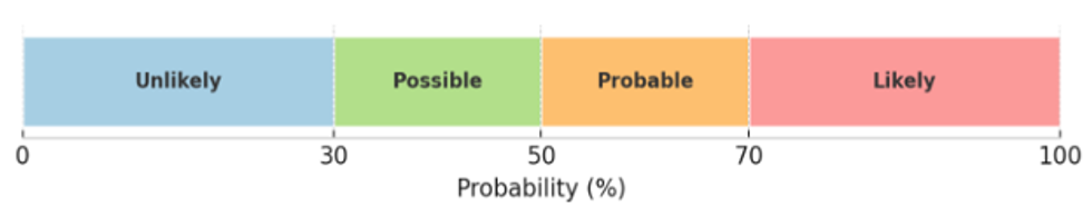 - More Usable – It may come across as flippant, but weighing four categories of probability is just more doable than weighing seven. This assertion becomes less flippant once you look more closely and realize that analysts are being asked to consider probability within 5-percentage point increments. Can any human (or any AI LLM) forecast the likelihood of human behavior to the 55th percentile? No. Are we equipped to give a general range? Yes. The current gauge is asking analysts to split hairs when, instead, we should be bundling those hairs to give a more realistic assessment of whether events will occur.